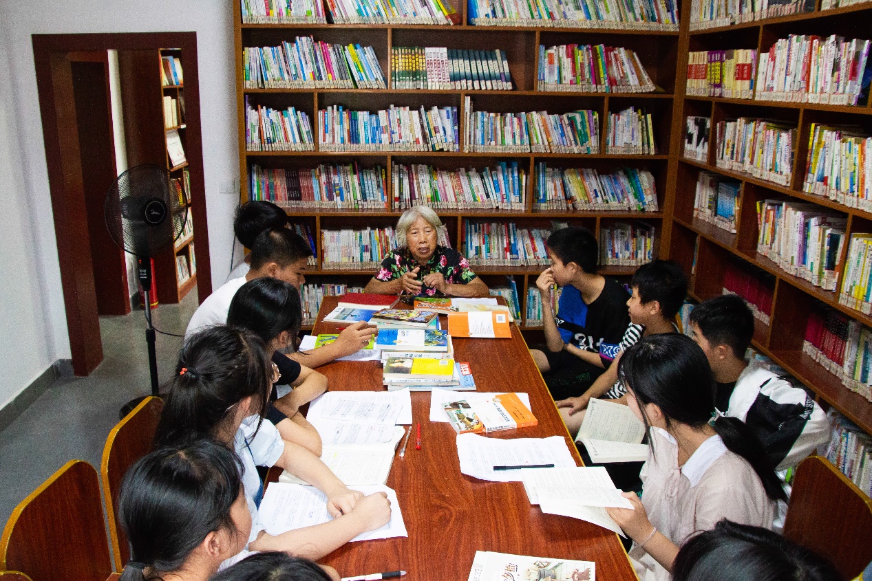 坐落在少儿假期学校附近的农家书屋在小雨中,更显别致。八年级同学们与支教志愿者刘楚怡围坐于书桌旁,杨莲金老师悄悄搬了一把凳子坐在角落,认真听着支教志愿者与同学们的发言,并鼓励每位同学勇敢地表达自己的观点。同学们从写作背景、人物形象、拓展想象三个方面谈及对《朝花夕拾》的理解。刘楚怡对同学们阅读这篇文章遇到的问题进行解答,并给他们分享了读书的三个方法——学会找到一本书的背景、学会找到一本书的主题、学会与一本书建立联系。