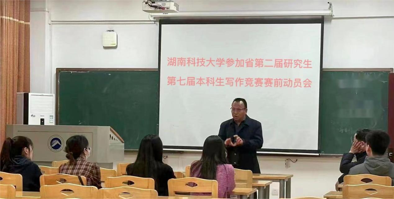 动员会上,袁星洁结合本科生及研究生省创意写作大赛历届考察情况,对参赛选手们进行赛前“补习”。他从创意写作、文学评论、演讲与写作三个项目出发,为本科生讲解参与省大学生第七届创意写作大赛的注意事项。针对研究生参加湖南省研究生第二届创意写作大赛,他嘱咐道:“省赛一定要写出自己当下真实的感受,表达出自己的真情实感。在赛前可以练习叙事性散文写作,锻炼自己在这方面的写作能力。”随后,他强调各位选手在赛前应主动联系各自的指导老师并进行适当的训练,做好充足的准备。