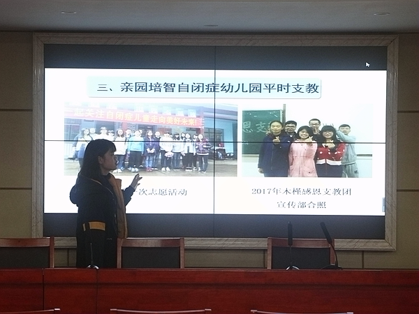“十五年来,志愿团开展了许多丰富多彩且有意义的志愿活动……”志愿团代表宋楠为志愿团进行宣讲,从“三下乡”社会实践、“关爱冯家村留守儿童”活动到湘江保护活动,志愿团践行着志愿服务精神,为社会贡献一份自己的力量。随后,中国大学生“自强之星”吴玉蓉向同学们讲述了她参加的志愿活动:安平镇公益行、洗心基金会助学走访、湘潭市特殊教育学校志愿活动……,“提升自己,帮助他人”,她表示自己会继续学习,努力考研,回报社会。