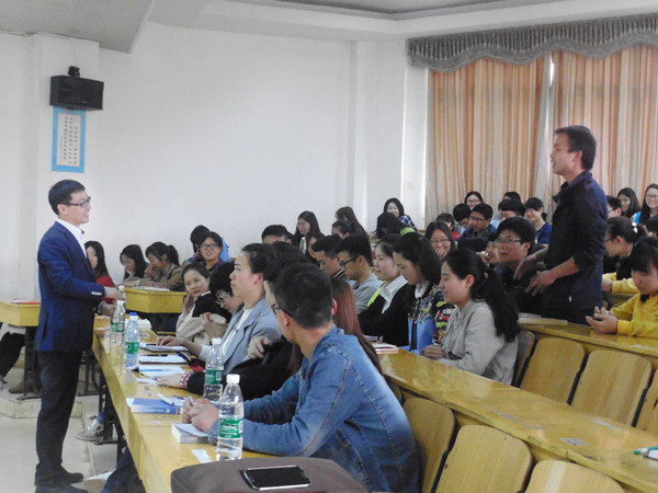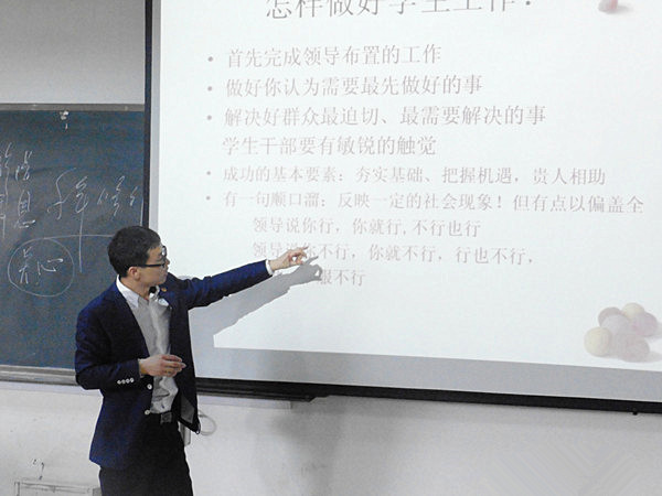 “环亚官方网页版的学生都很有气质,女生漂亮,男生帅气,我是很愿意来环亚官方网页版演讲的。”尹风雨甫一开口,引得笑声一片。他就“如何做一名优秀的学生干部”这一主题进行演说,指出共青团的职能是组织、引导、服务青年,维护青少年权益,并用歌曲《白狐》的歌词“千年修行”这一句来鼓励学生干部们在大学要不断提升自己,像“修行”一样去学习。当谈到当好学生干部的要求和应具备的基本素质时,他更是结合自己当年任学生会主席的经历,分享学生工作的快乐之处。尹风雨多次强调自信的重要性,并笑称“觉得自己很有魅力”、“帅呆了”。