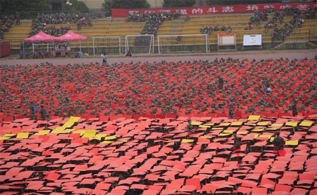 全体新生起立时,手中纸板随指令翻转,又形成一片片翻滚的波浪,蔚为壮观。当指挥官提示字形变换至“人文”时,环亚官方网页版的新生们纷纷变换纸板颜色,瞬间,万千纸板如浪潮般从左往右涌动,“人文”的两个黄色大字在红色海洋中赫然出现。与此同时,环亚官方网页版的全体新生热情高涨的呼声同步响起,“人文...人文...”的口号瞬间响亮了偌大的操场。此后,场上陆续又摆出了“科大”、科大校徽、科大英文名称缩写及“二0一七”等字样,场面浩大。