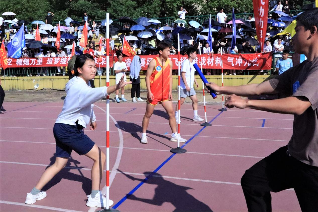 骄阳似火,运动员们早早来到比赛场地进行热身动作,等待比赛开始。一声“预备”,4×100m接力赛拉开序幕,运动员们如离弦之箭,向终点奔去。伸手、等待、递棒、接棒,一系列动作在人文运动员经过数日的训练后变得行云流水,前后配合得默契十足。