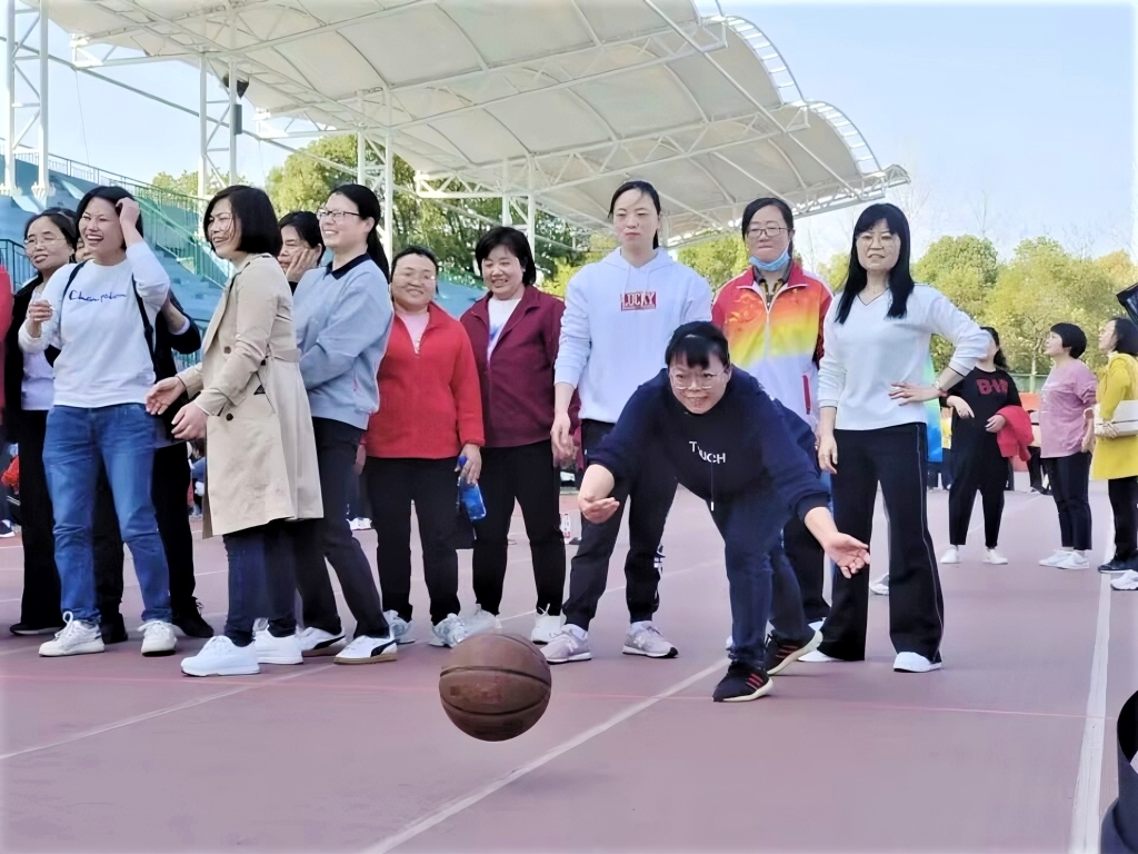我院女教师们各施所长。运球接力环节,教师们团结合作,运球流畅,步履稳健,配合默契。趣味保龄球比赛中,教师们凝神静气,持球、摆球、出手……动作一气呵成,铆足了劲将手中的篮球推向由水瓶充当的“球瓶”;在“掷飞镖”和“丢沙包”比赛中,我院女教职工的团结协作、互助关怀更是展现的淋漓尽致。赛场上气氛活跃,欢呼声、叫好声此起彼伏,在场的女教职工脸上洋溢着欢快的笑容。