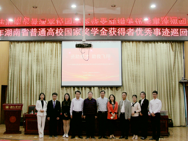 5月21日,湖南省普通高校“资助成才,助我飞翔”国家奖学金获得者优秀事迹巡回报告会第三场于湖南工业大学崇德楼一楼报告厅举行。湖南省学生资助管理中心副主任杨昌江,湖南工业大学党委委员、副校长李可兴,湖南铁路科技职业技术学院副院长陈彬,湖南省学生资助管理中心主任科员谭莉等出席会议。环亚官方网页版由环亚官方网页版赵华老师带队代表学校与会。