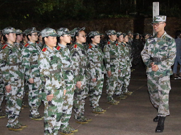 在助班的带领下,新生们早早地来到训练场地整理好队伍,等待教官的到来。晚上7时,各排教官准时来到训练场地。集中完毕后,连长王阳首先作了自我介绍:“我姓王,单名阳,你们看到太阳的时候就是训练的时候。”他指出近期新生中存在的自由散漫等问题并提出五点要求:时刻注意军容军纪,请假时严格遵循程序,弘扬集体主义精神,能够吃苦耐劳,注重礼貌礼节。“当你们穿上军装,你们就不再是学生,而且中华人民共和国的一名预备军人,要用军队的要求来严格要求自己!”,王阳简述了自身在部队中学习到的精神,并以此激励新生不畏艰难,“军队的精神就是,没有困难克服不了,没有敌人战胜不了,没有任务完成不了!”在简单提问以确保新生熟记纪律后,王阳再次强调了请假问题,并补充说明军训不是为了折腾学生,而是为了考验受训者的毅力和耐心,锤炼出军人般的意志,最终将军训中学习到的品质落实到生活中。